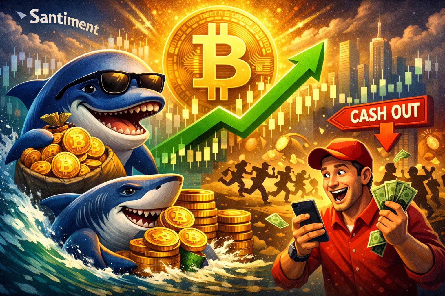 A acumulação de Bitcoin por grandes investidores — conhecidos como baleias e tubarões — combinada com a recente realização de lucros por parte do varejo, pode ser interpretada como um sinal altista para o mercado cripto. A avaliação é da plataforma de análise on-chain Santiment.