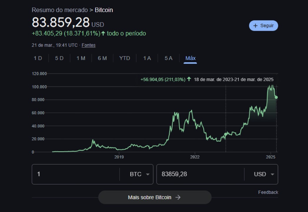 Sim, ele oscila. Sim, ele pode cair 30% em dias. Mas o que impressiona é que mesmo depois de uma queda de 30%, o Bitcoin ainda entrega quase 200% em 2 anos. Isso não é coincidência. É sinal dos tempos.