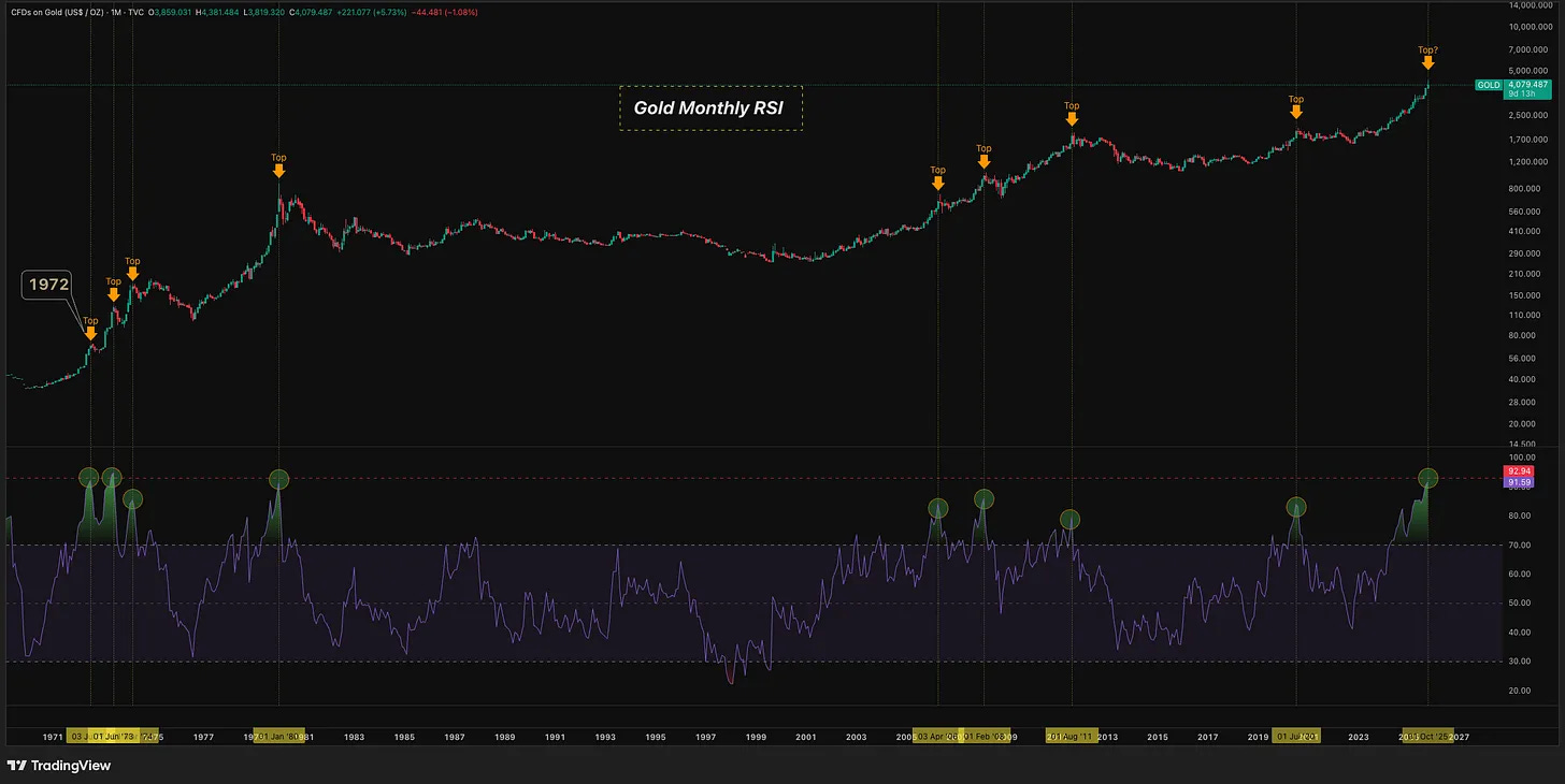 O mercado global viveu um dos dias mais intensos de 2025. O ouro registrou uma queda histórica de 5,2% em 21 de outubro, a maior desde 2020, após atingir níveis extremos de sobrecompra. No topo, o metal era negociado 33% acima da média móvel de 200 dias, com RSI em patamares similares aos picos de 1972, 1979 e 1980.