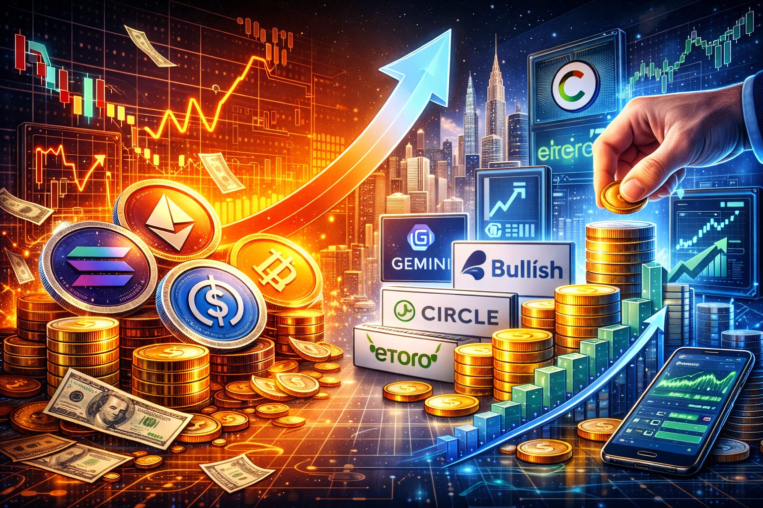 Em 2025, captações por meio de ofertas públicas iniciais (IPOs) de empresas ligadas ao setor cripto somaram cerca de US$ 14,6 bilhões — salto expressivo em relação ao ano anterior. Já operações de fusões e aquisições (M&A) superaram US$ 42,5 bilhões, o maior volume em cinco anos.