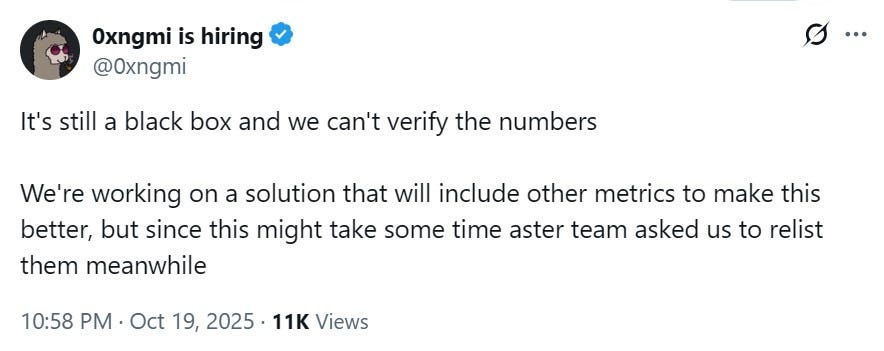 “Estamos trabalhando em uma solução que vai incluir outras métricas para melhorar isso, mas como isso pode demorar um pouco, a equipe da Aster pediu para ser relistada nesse meio tempo”, explicou 0xngmi.