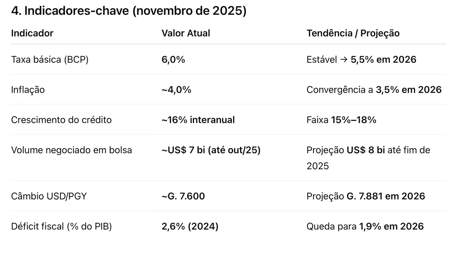 Inflação ao redor de 4%, com expectativas ancoradas em 3,7% para os próximos 12 meses e convergência ao objetivo de 3,5% do Banco Central do Paraguai (BCP) em 2026.