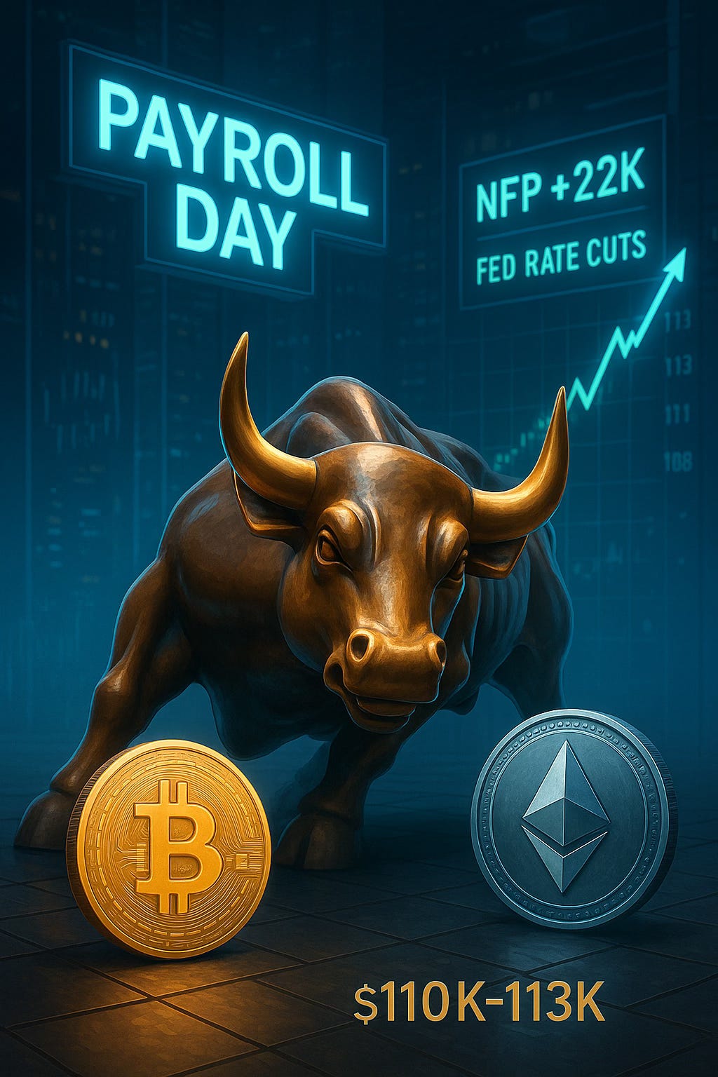 O Bitcoin (BTC) abriu o dia cotado em US$110.431, com máxima em US$113.237 e mínima em US$109.378diario-crypto-05-09. O mercado segue atento ao Payroll (NFP) de agosto, que trouxe apenas 22 mil vagas criadas nos EUA e taxa de desemprego em 4,3%, reforçando expectativas de corte de juros já na reunião do Fed em 17–18 de setembro. A probabilidade de redução de 25 bps saltou para a faixa de 88% a 99%, com parte do mercado já especulando cortes de 50 bps.