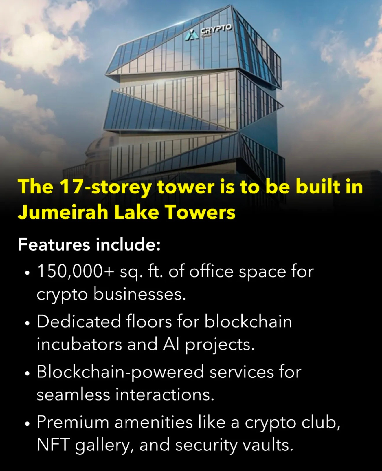 A Crypto Tower será construída em Jumeirah Lake Towers, uma das áreas mais estratégicas para negócios na cidade. O prédio contará com: