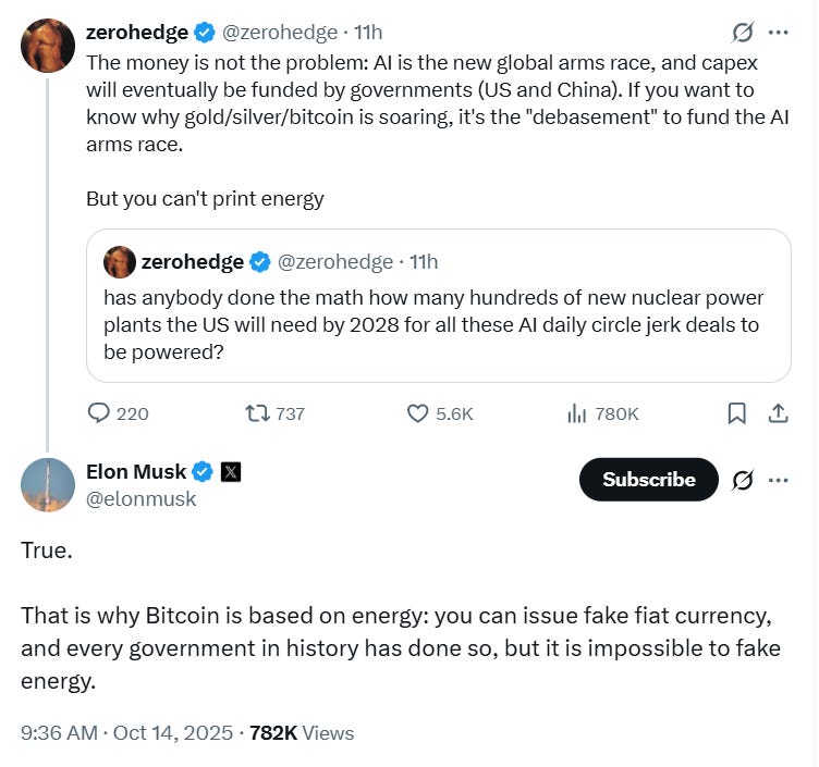 “Você pode emitir moeda fiduciária falsa — e todos os governos da história já fizeram isso — mas é impossível falsificar energia. É por isso que o Bitcoin é baseado em energia”, escreveu Musk em postagem no X.
