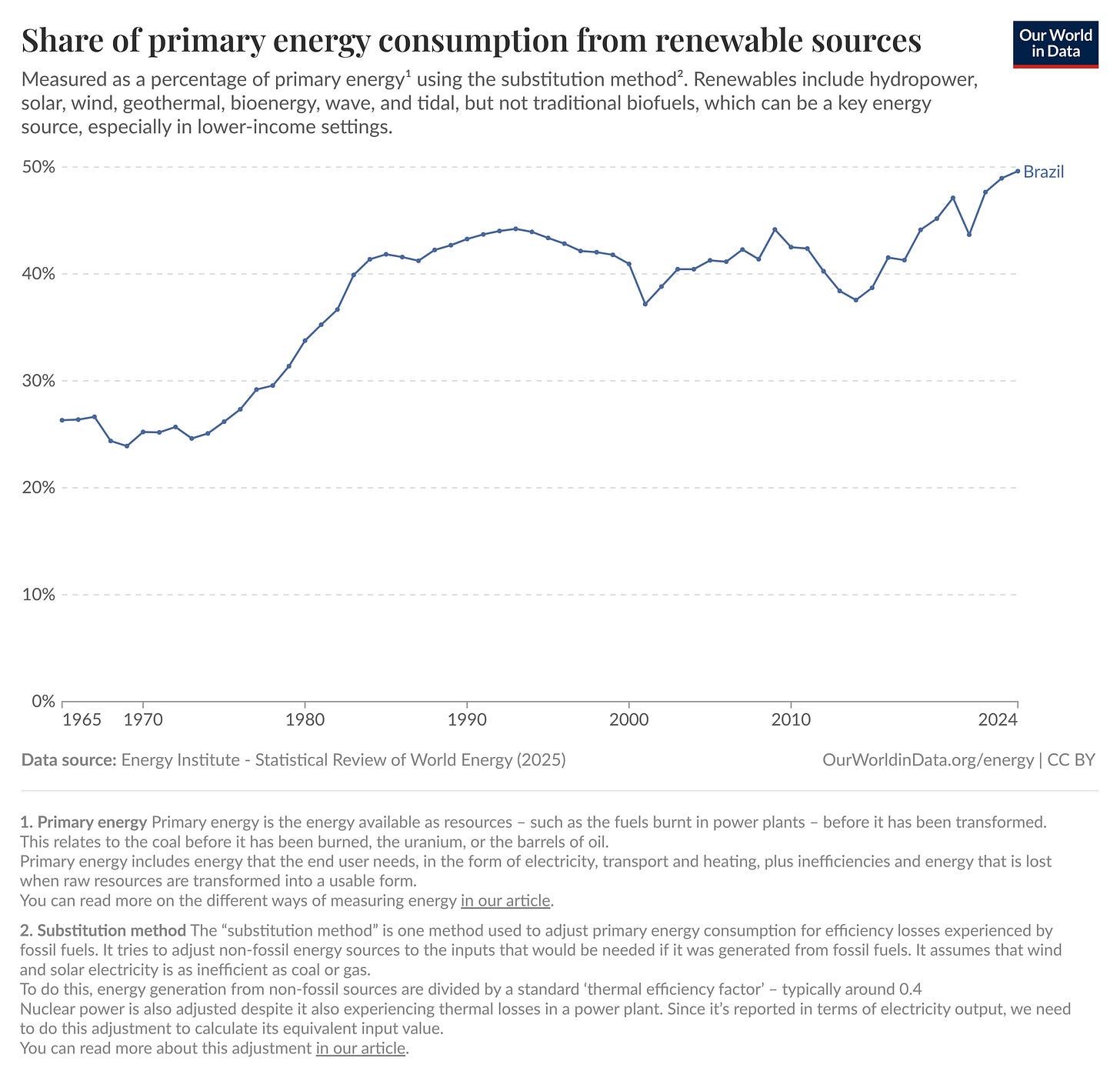 Gráfico da porcentagem de energia renovável no Brasil. Fonte: OurWorldInData