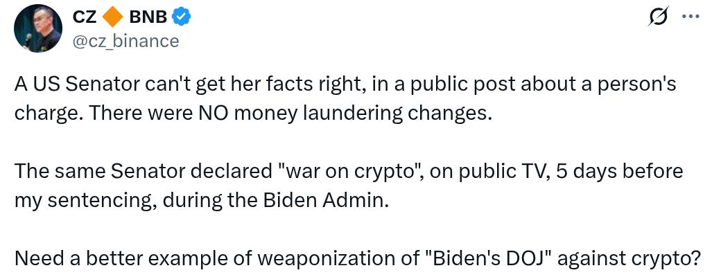 O cofundador da Binance, Changpeng “CZ” Zhao, respondeu duramente à senadora americana Elizabeth Warren, que afirmou que ele “se declarou culpado de uma acusação criminal de lavagem de dinheiro”. Em publicação na plataforma X nesta sexta-feira, CZ rebateu: