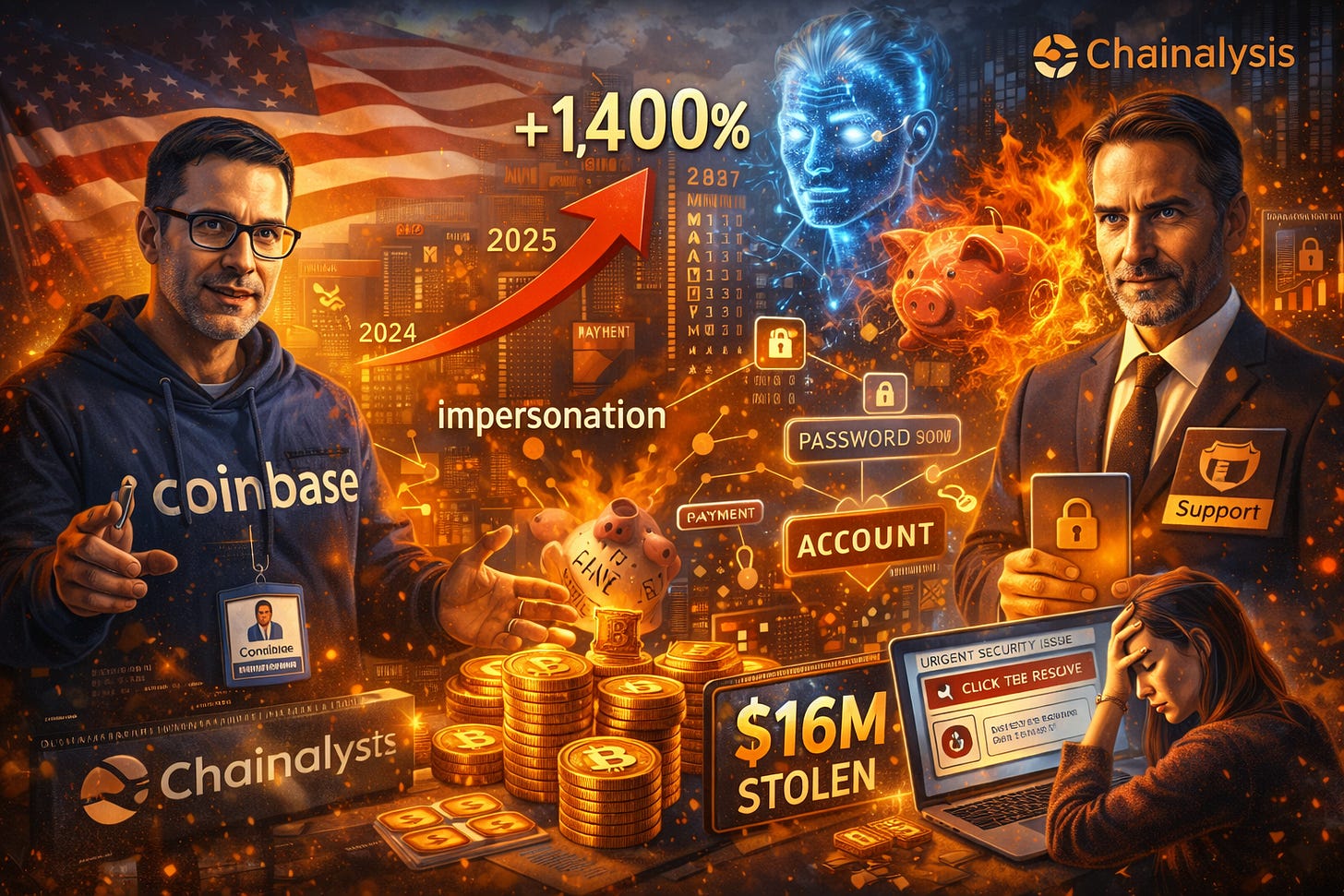 Além do crescimento no número de casos, o valor médio roubado por golpe de impersonação aumentou mais de 600%, o que a Chainalysis classificou como uma “tendência preocupante”. Um dos episódios mais emblemáticos de 2025 envolveu criminosos que se passaram pela corretora Coinbase, resultando em prejuízos próximos de US$ 16 milhões para as vítimas.
