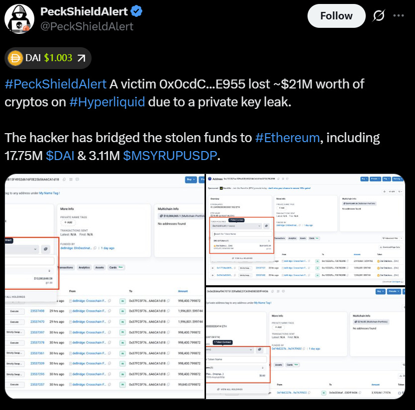 Um único usuário da plataforma descentralizada Hyperliquid perdeu aproximadamente US$ 21 milhões na quinta-feira após um vazamento de chave privada que levou a um exploit no protocolo de empréstimos Hyperdrive.