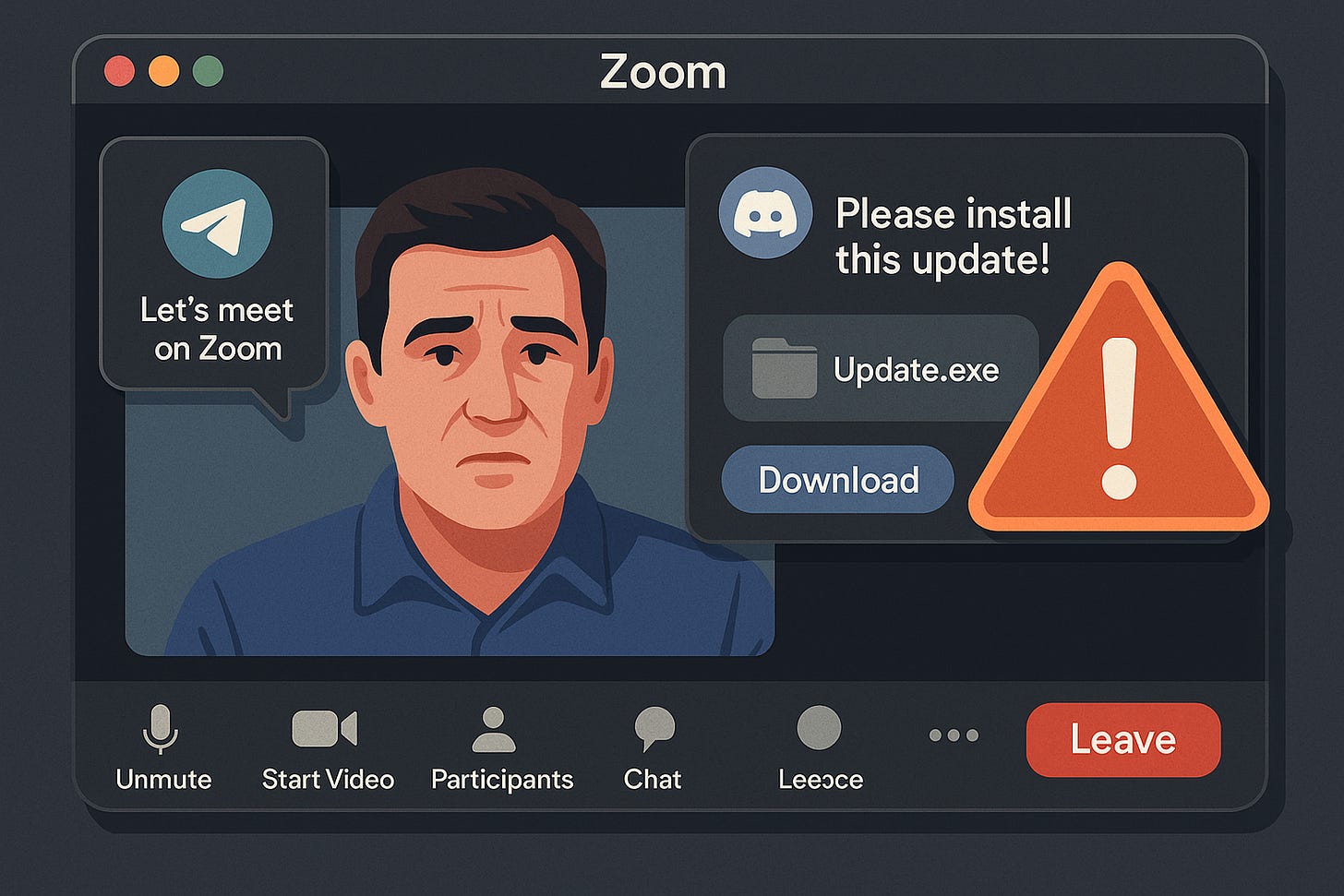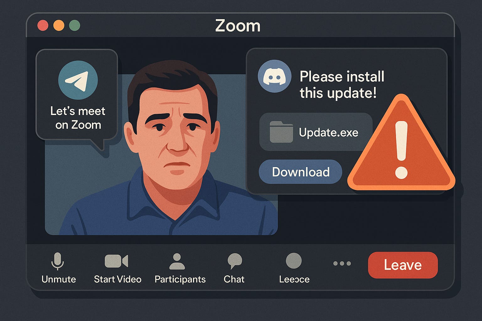 Durante a reunião, os golpistas simulam problemas de áudio e, em seguida, enviam um suposto arquivo de correção (patch). Ao abrir o arquivo, o computador da vítima é infectado com malware, permitindo o acesso remoto ao dispositivo.