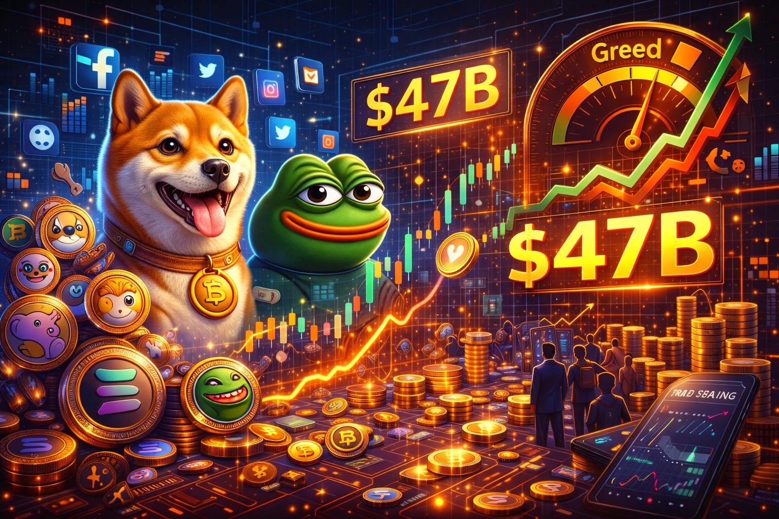 Após uma queda profunda de mais de 65% ao longo de 2025, que levou o valor total do setor a cerca de US$ 35 bilhões, o valor de mercado das memecoins saltou novamente para mais de US$ 45 – 47 bilhões nos primeiros dias de 2026, acompanhando um aumento substancial no volume de negociações.