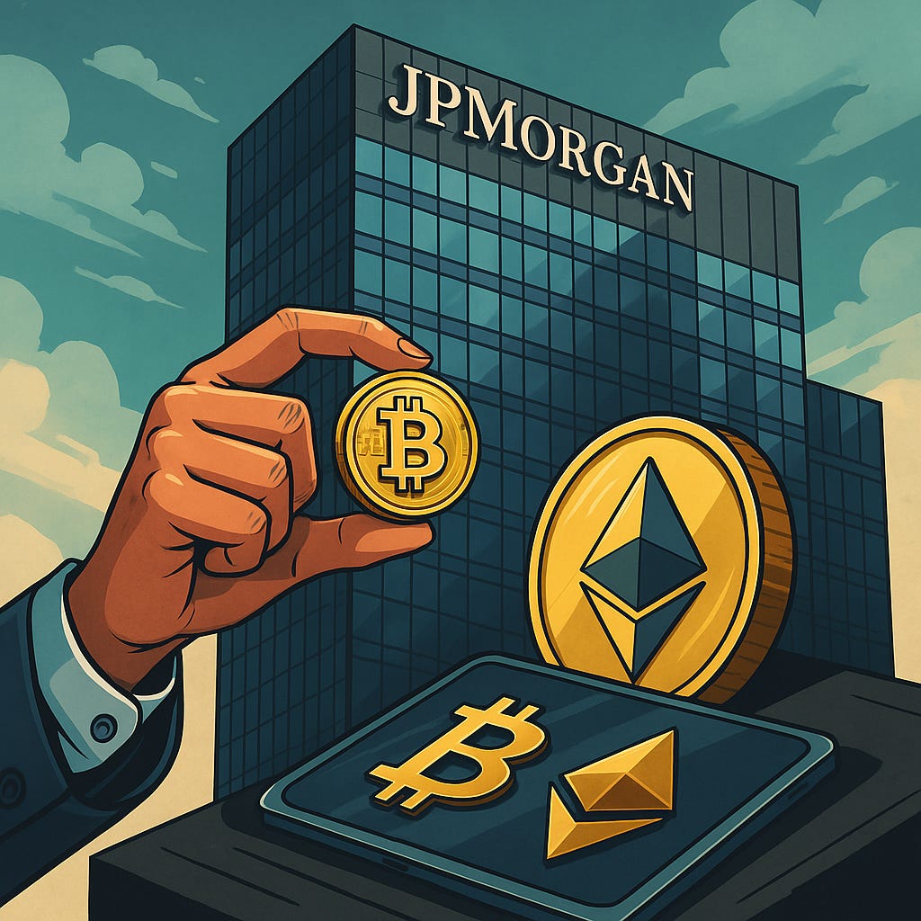 A JPMorgan foi uma das primeiras grandes instituições financeiras dos EUA a entrar no mercado cripto, lançando a JPM Coin — sua stablecoin própria — em 2020. Em 2024, a empresa passou a deter participações em ETFs de Bitcoin.