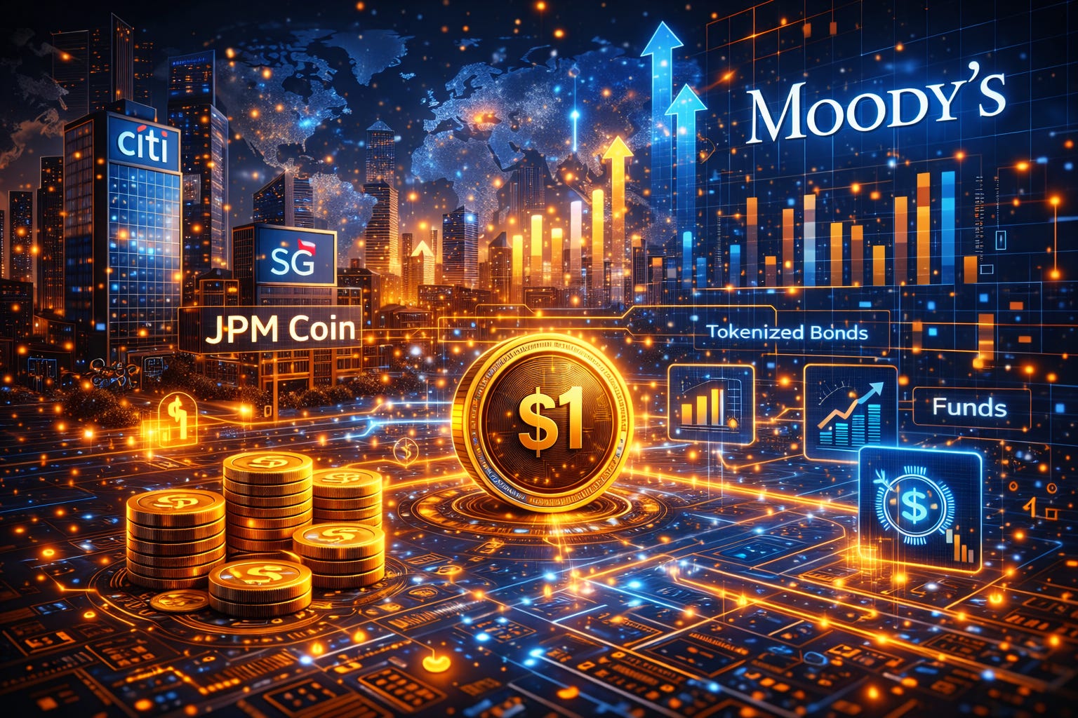 A Moody’s destacou que, ao longo de 2025, instituições reguladas utilizaram stablecoins lastreadas em caixa e em títulos do Tesouro dos EUA para facilitar movimentações intradiárias entre fundos, pools de crédito e plataformas de negociação. Entre os bancos citados em testes e iniciativas estão Citigroup e Société Générale.