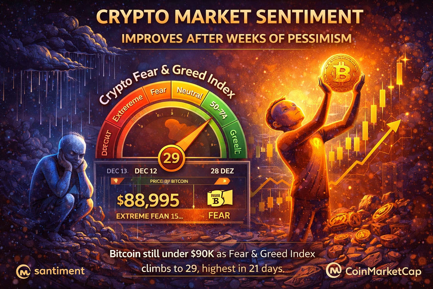 O sentimento do mercado de criptomoedas mostrou sinais de melhora nesta sexta-feira ao deixar oficialmente a zona de “medo extremo”, após quase dois meses de pessimismo contínuo. O Crypto Fear & Greed Index, um dos principais termômetros de humor do setor, subiu para 29 pontos, classificação ainda de “medo”, mas no nível mais alto desde 12 de dezembro.