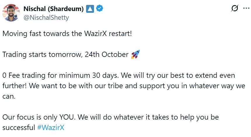 Após mais de um ano de paralisação, a exchange indiana de criptomoedas WazirX anunciou que retomará suas operações nesta sexta-feira, com taxa zero de negociação por pelo menos 30 dias. A medida faz parte de um plano de retomada gradual, projetado para restaurar liquidez, confiança dos usuários e estabilidade operacional depois de um dos maiores ataques hackers já sofridos por uma exchange na Ásia.
